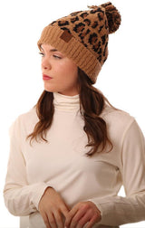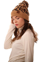 Cozy Knit Pom Pom Foldover Leopard Print Tan Warm Winter Beanie
