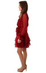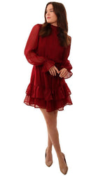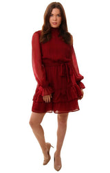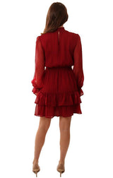 Dresses Long Sleeve Tie Waist Layered Ruffle Burgundy Mini Holiday Dress