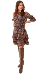 Dresses Ruffled Floral Printed Smocked Waist Navy Tan Mini Dress