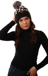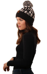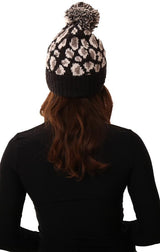 Cozy Knit Pom Pom Foldover Leopard Print Black Warm Winter Beanie