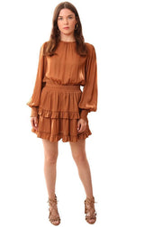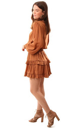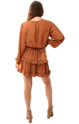 Do And Be Dresses Long Sleeve Smocked Waist Layered Ruffle Silky Brown Mini Dress