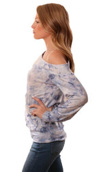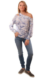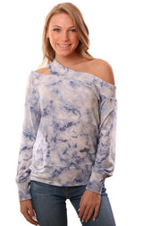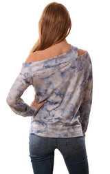 Red Haute Tops Long Sleeve Cutout Shoulder Blue Marbled Print Top