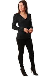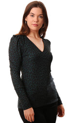 Veronica M Tops V Neck Pouf Sleeve Animal Print Soft Black Teal Pullover Top